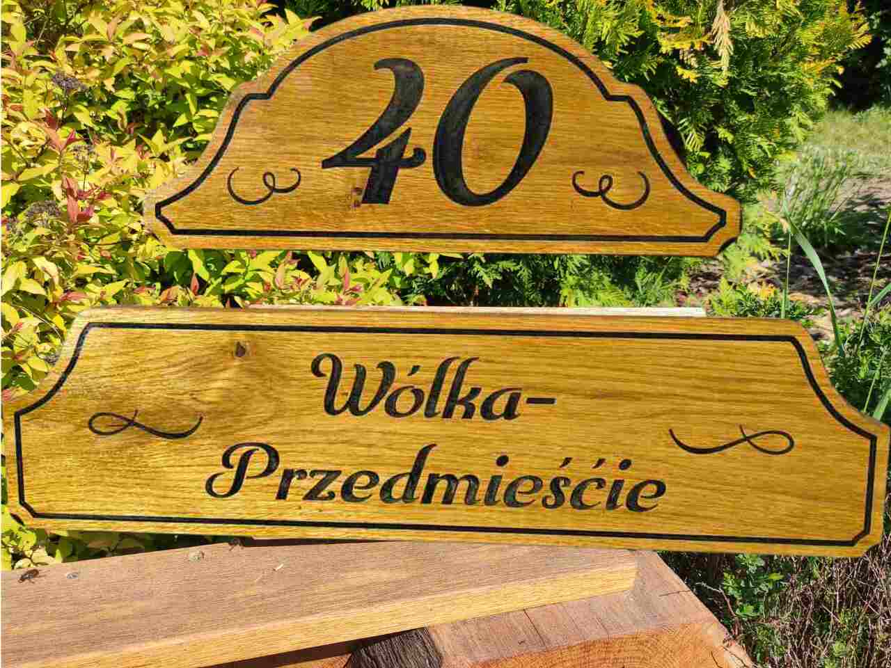 Drewniana tablica adresowa z numerem domu – napisy zalane żywicą