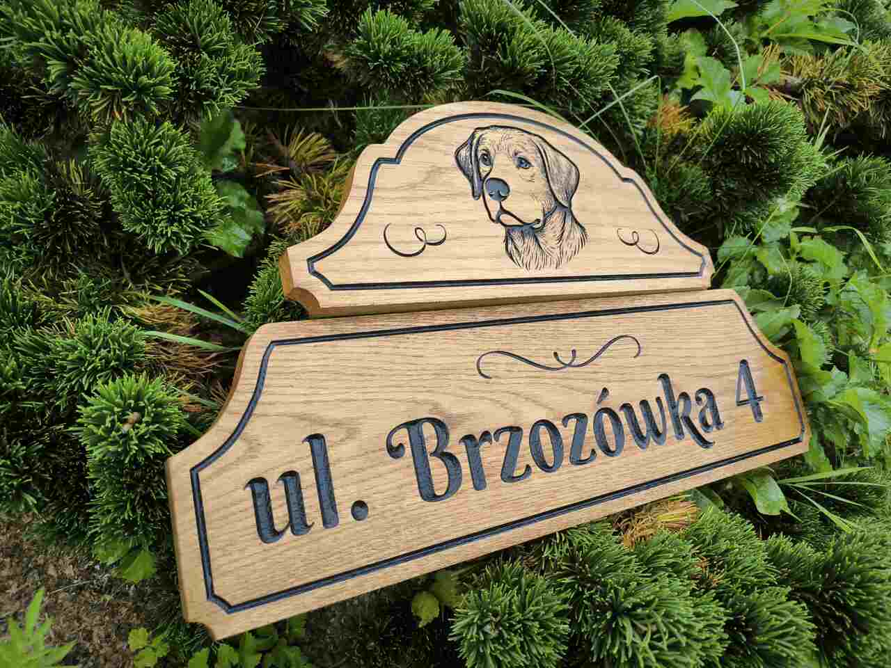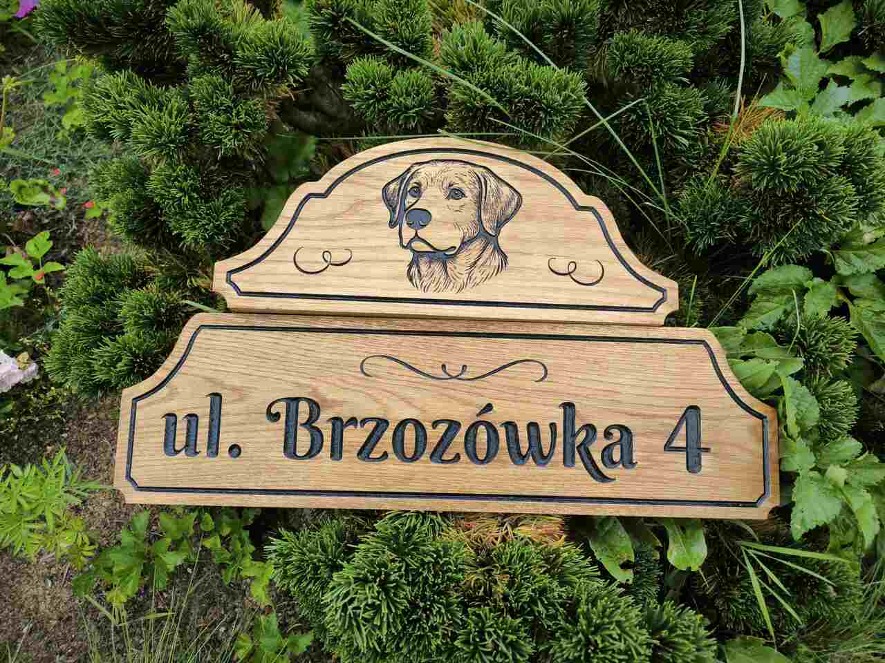 - Dwuczęściowy design: Tabliczka składa się z dwóch desek – mniejszej na numer domu i większej na adres. Dzięki temu prezentuje się elegancko i przejrzyście.